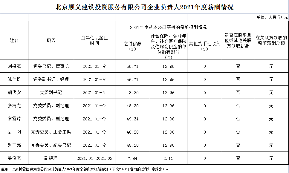 北京順義建設投資服務有限公司企業負責人2021年度薪酬信息披露
