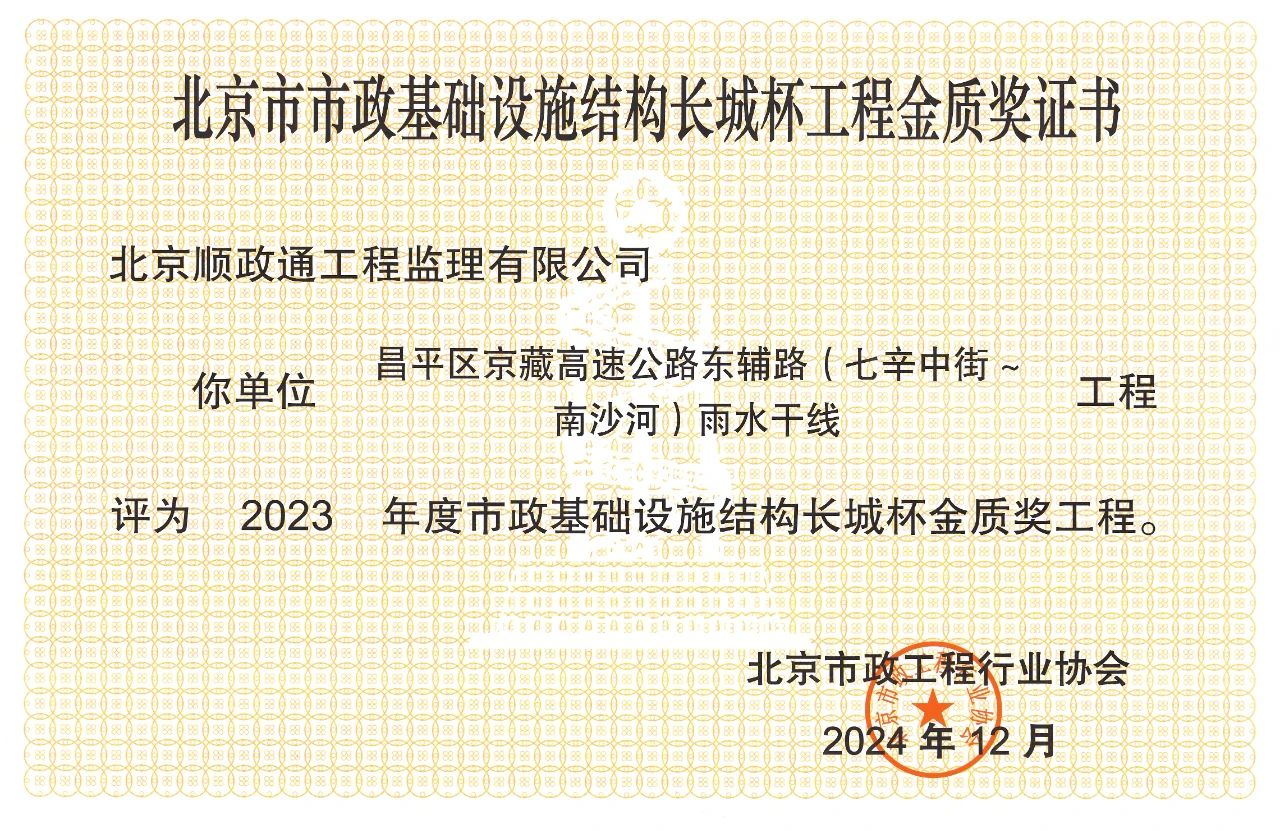 順政通監(jiān)理公司喜獲北京市市政基礎(chǔ)設(shè)施工程結(jié)構(gòu)長(zhǎng)城杯金質(zhì)獎(jiǎng)