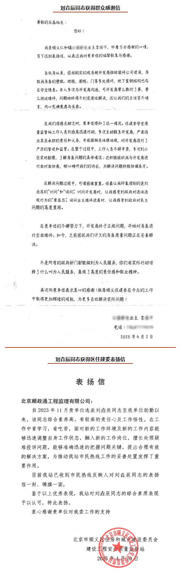 劉垚辰同志在服務過程中,始終以駐勤工作為中心、以切實解決群眾需求為導向,變“被動”為“主動”,充分發揮在監理方面的專業所長,以過硬的業務知識,創新工作方式,主動傾聽群眾訴求,加班加點做好協調,接連獲得群眾致謝錦旗及感謝信,生動詮釋了"民有所呼,我必有應"的服務擔當,為助力質監站相應工作的開展貢獻了重要力量,充分展示了順政通員工愛崗敬業的優良品質,彰顯了順政通公司一貫堅守的嚴謹務實、精益求精的工作作風。
